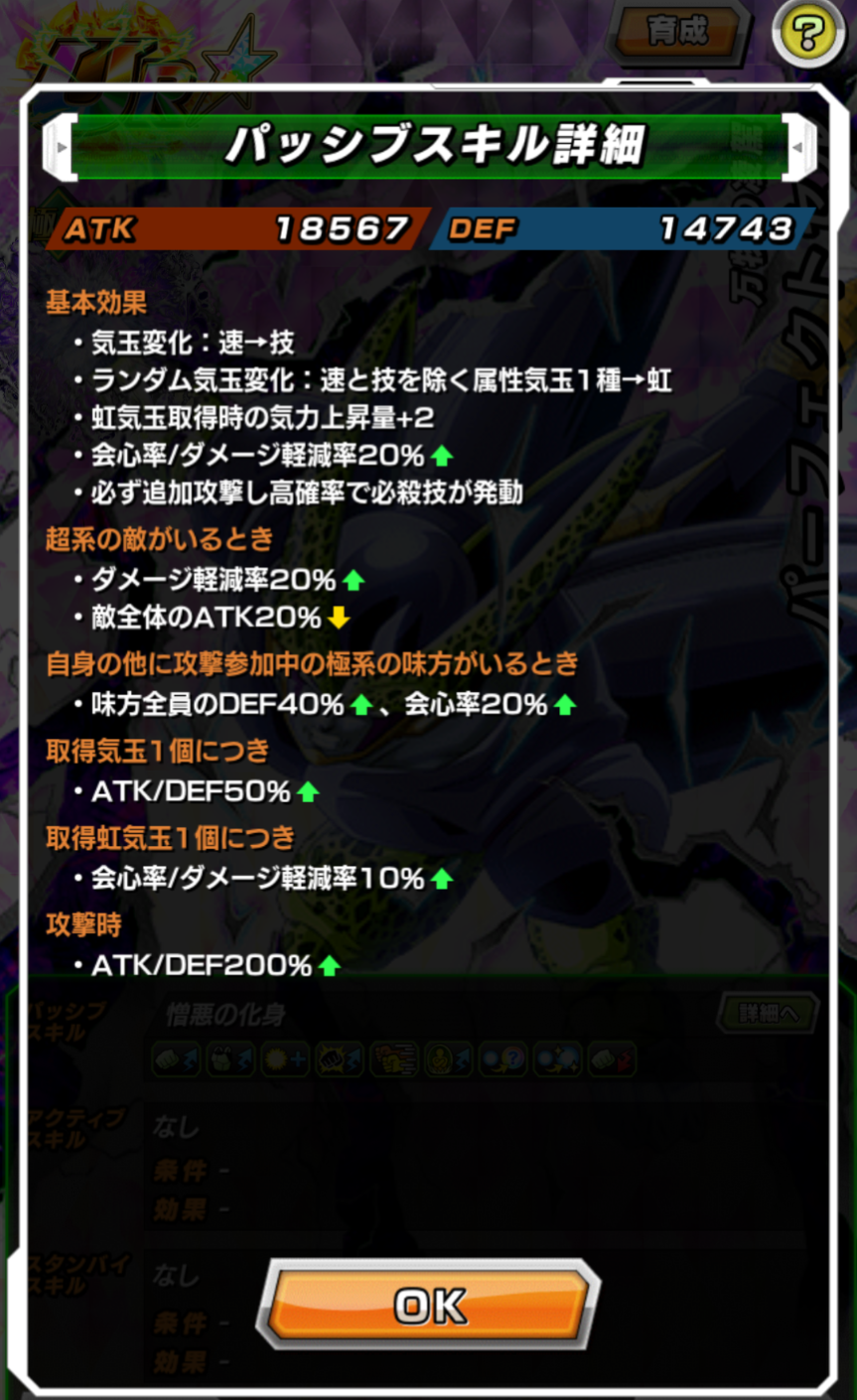 まあ今の人造人間編成にサポーターは供給過多、自身が主役を張れる戦力が欲しいので『100%スタメン』とかそういう感じではないでしょうが、敵が気弾必殺ならまず使うだろという感じになったし、特定チーム特化の通常ガシャ産キャラのパワーアップとしては理想的と言えそうです。