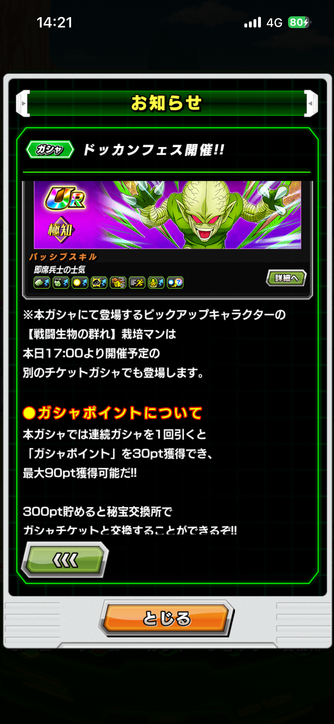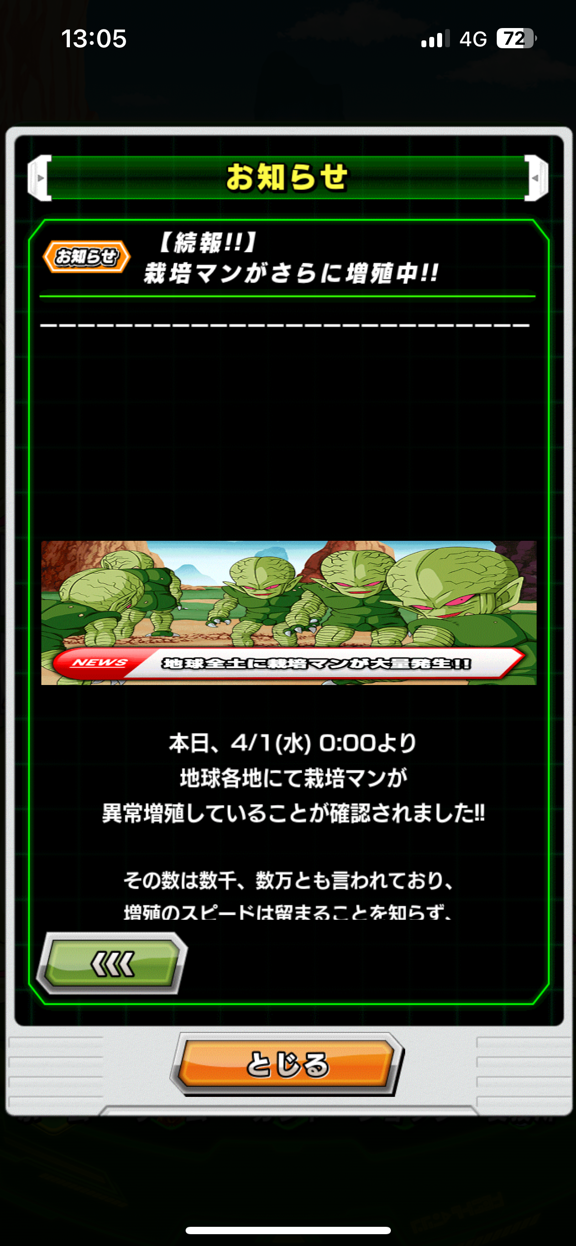 2017年エイプリルフールの配布キャラ・【無限の戦闘員】栽培マンが奇跡の復刻、そしてドッカン覚醒が追加されています。
