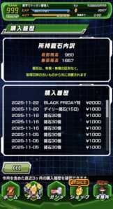 次回のガシャである聖龍祭はセール期間的に16以降の開催、その後の年末WフェスはCPの切れ目的に29日頃の開催となりそうで、向こう1ヵ月にはより重要になりそうなガシャも2つ控えています。