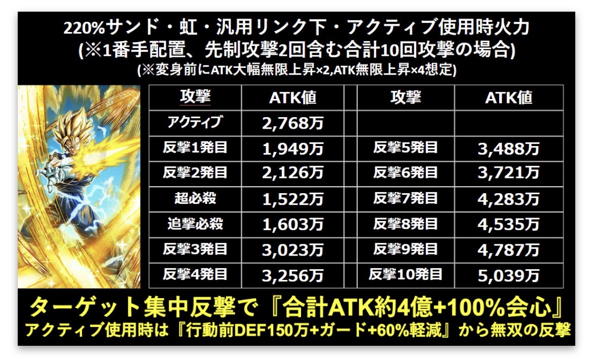 被弾する程火力が上がるタイプなのでLR【究極を超えた新たな力】孫悟飯(ビースト)のように3番手に置きたくなりますが、ベジットの場合は早めに行動した方が反撃火力も上がって必殺技耐性も完璧になるので1番手に置いてターゲット集中するのが無難な運用方法です。