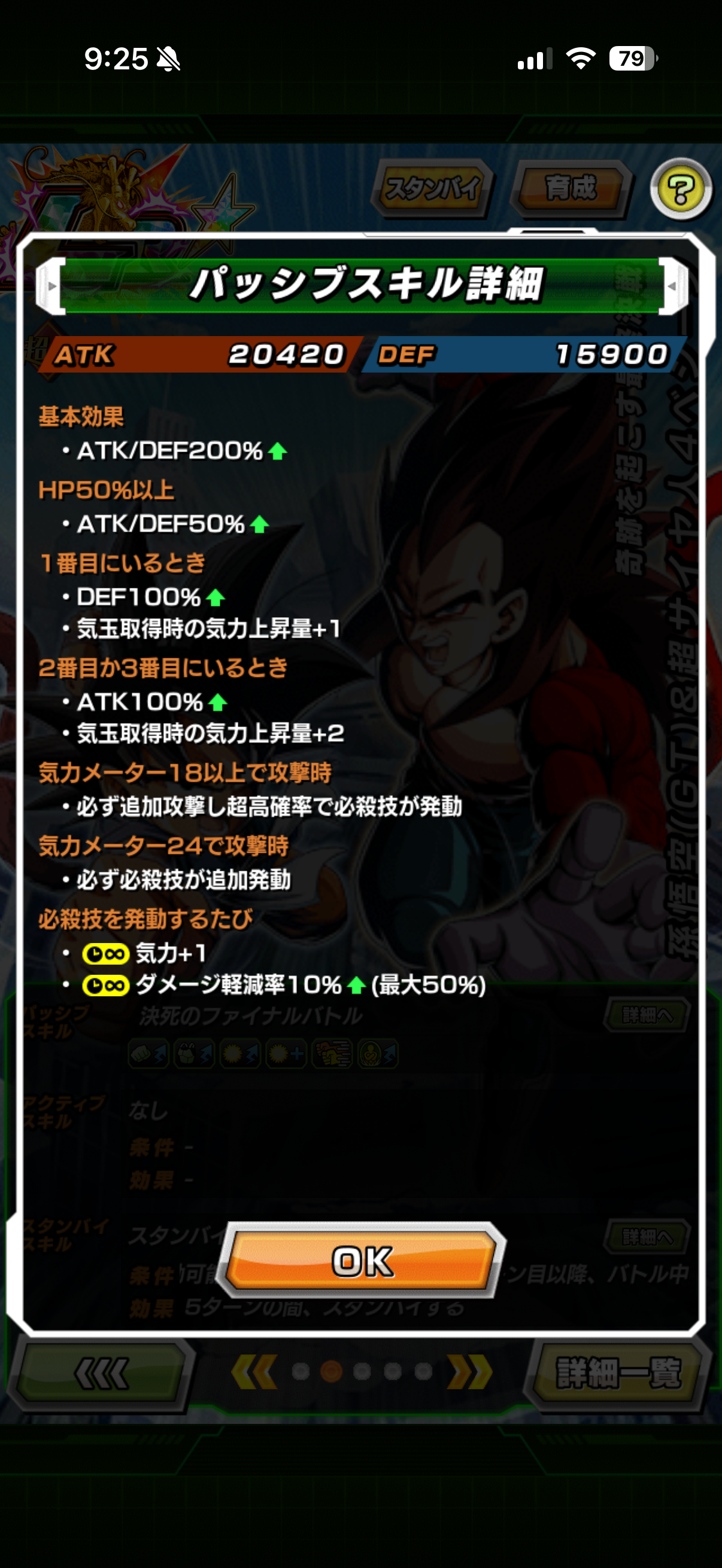 しかし前述のようにこのベジータは回避率サポートだのアクティブサポートだのを受け取って瞬間的には耐久ラインを一気に押し上げられる所もあるし、50%とはいえ回避という逃げ道を持っている時点でキャパシティ超えの敵にも対処出来る下地は持っているし、十分に『使いたい』と思わせてくれる性能設計でしょう。