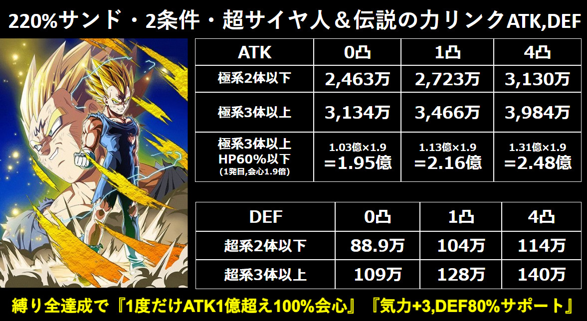 『超系縛り』『極系縛り』『特定のカテゴリorキャラ縛り』と色々な条件を持つキャラクターですが、基礎性能としては『気力を18貯めるだけで70%会心&70%軽減になる』という事で、自前の気玉変換能力も合わせて取り敢えず無難に戦って行ける実力は持っています。
