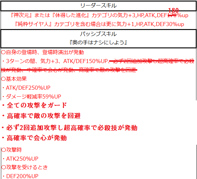 | 『神次元』または『体得した進化』カテゴリの気力+3,HP,ATK,DEF170%up 『純粋サイヤ人』カテゴリを含む場合は更に気力+1,HP,ATK,DEF30%up |