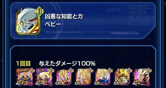 | vsベビー | 技属性(2回目) | 気絶無効 ATK,DEF低下無効 純粋サイヤ人カテゴリのキャラがいるとATK上昇 追加効果でATK,DEF上昇,DEF低下 |