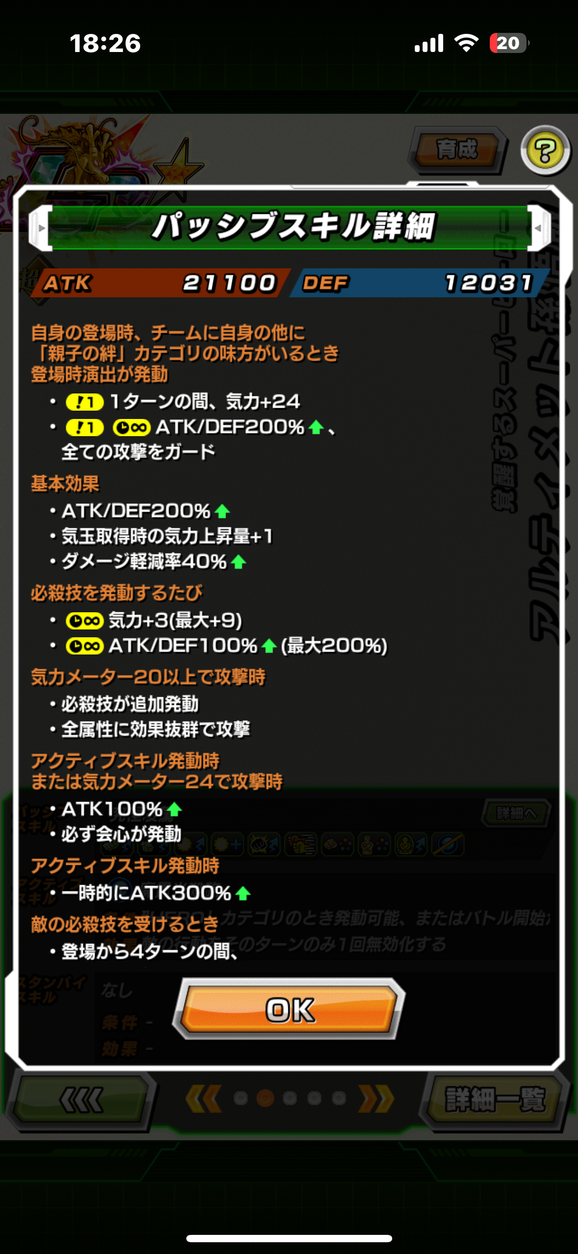 ②『気玉取得』の部分は取得と同時に発動するので行動前にも対応可能、気玉6個を取れば敵の先制攻撃も『DEF230%up&ダメージ50%軽減』で受ける事が可能です。