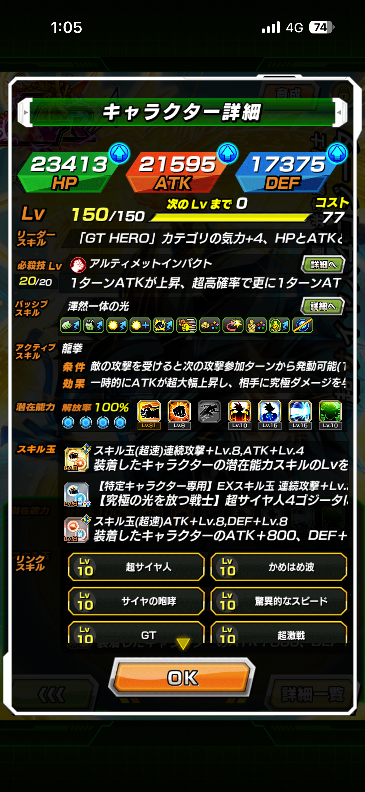100%解放時最高ATK(必殺威力UP+5選択),DEF(リンクレベル10)