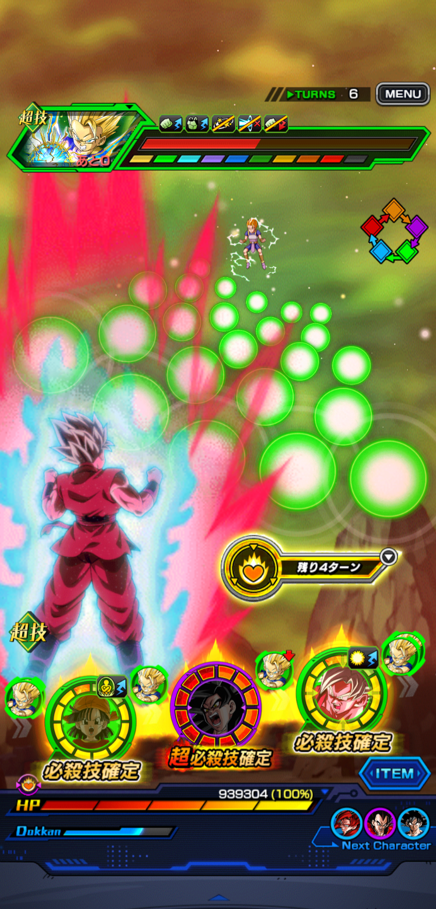 | 【条件】 自身のHP50%以下で発動可能、 またはバトル開始から4ターン目以降、 バトル中自身が4回以上攻撃すると発動可能 (1回のみ) 【効果】 5ターンの間、スタンバイし、 チームの味方の取得気玉1個につき チャージカウントが1増加する |