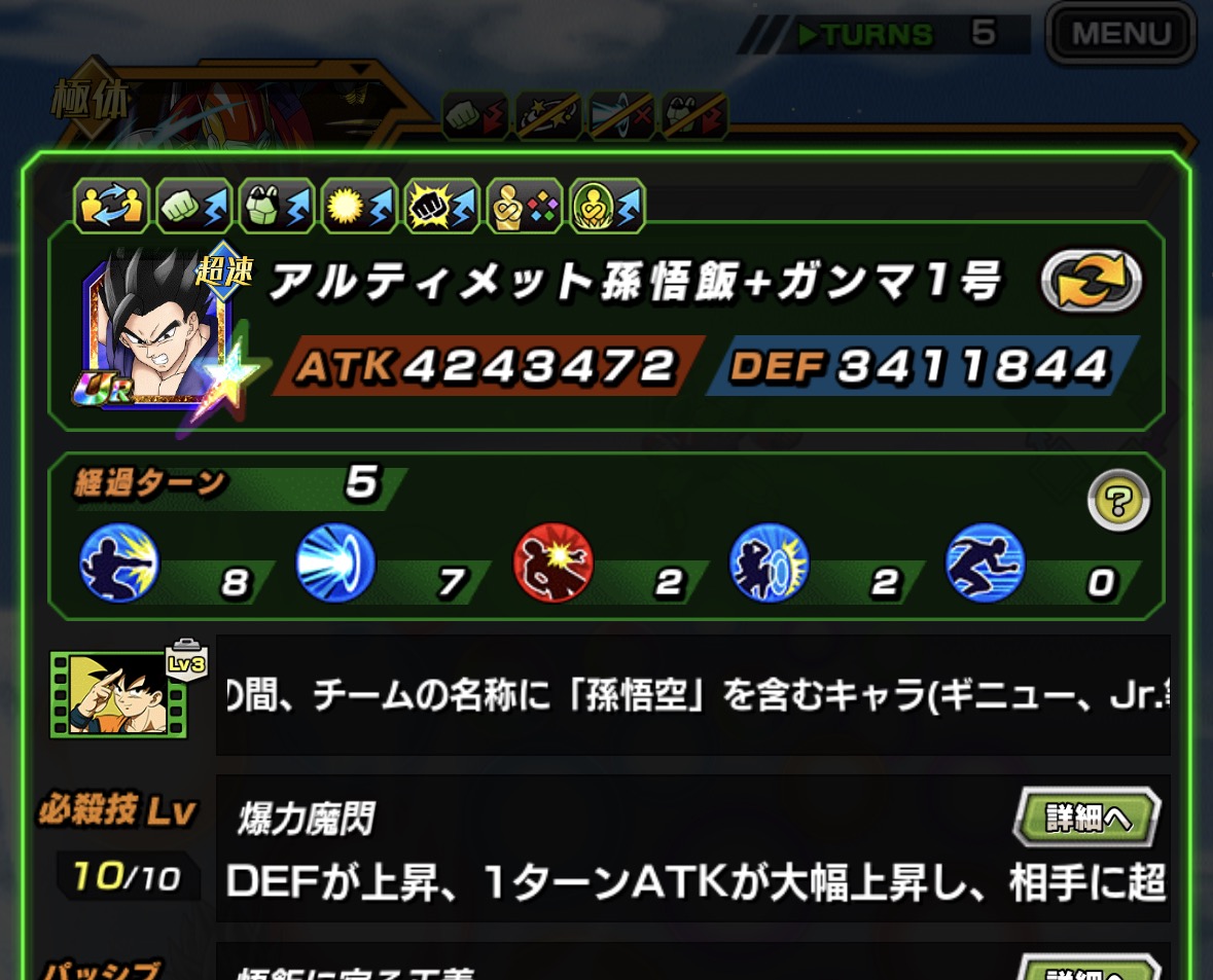 必殺技追加効果…1ターンATK50%up(必殺倍率加算),99ターンDEF30%up