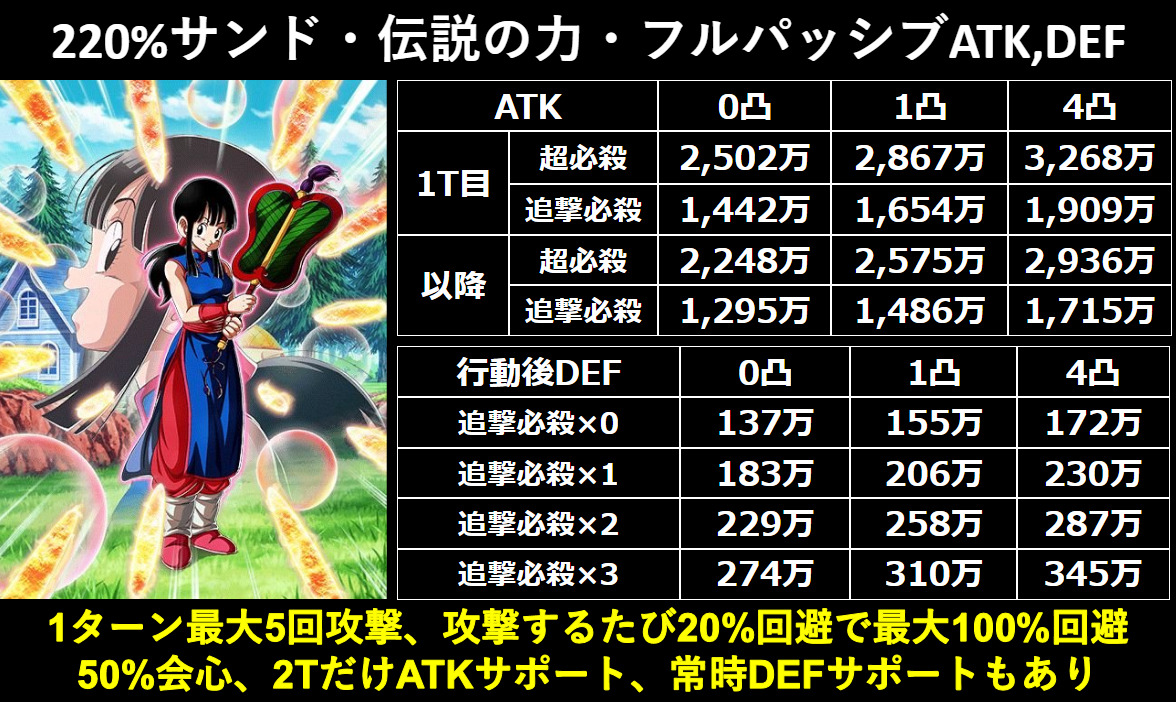 前述のように『地球育ちの戦士』『親子の絆』『孫悟空の系譜』なんかでは条件達成も容易いですがこの辺はこの2025年のフェス限やLR、極限キャラも大量に入って来る大規模カテゴリ、100%回避持ちとは言えそれも確率依存でリンクがボロボロで3枠目から動けず、全体攻撃や順列ロックにも非常に弱いこのチチが勝てる要素も無いでしょう。
