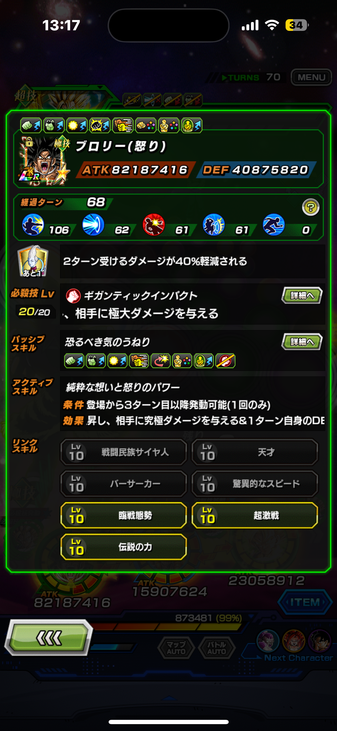 このブロリーの強さはなんと言っても尻上がりな強さにあり、『8回攻撃・8回被弾』でパッシブスキルの基礎部分は完成しますが、更にそこから『必殺技被弾パッシブ・ATK,DEF上昇追加効果』により青天井に戦闘力を上げて行きます。