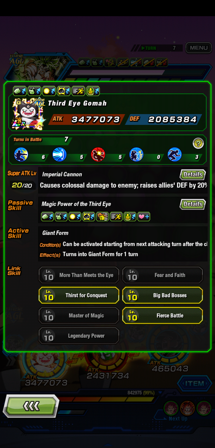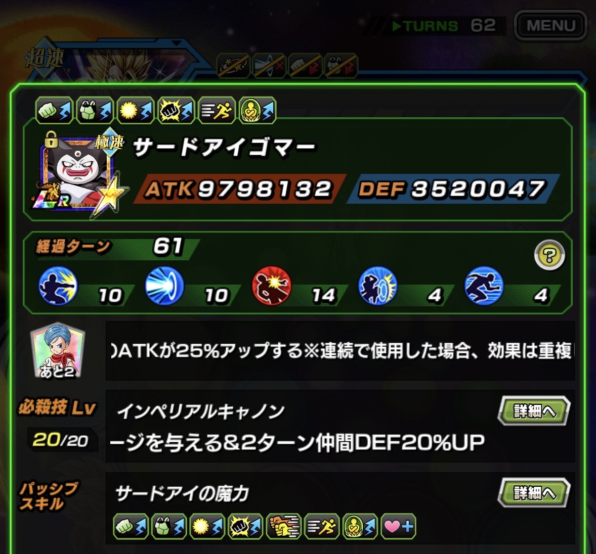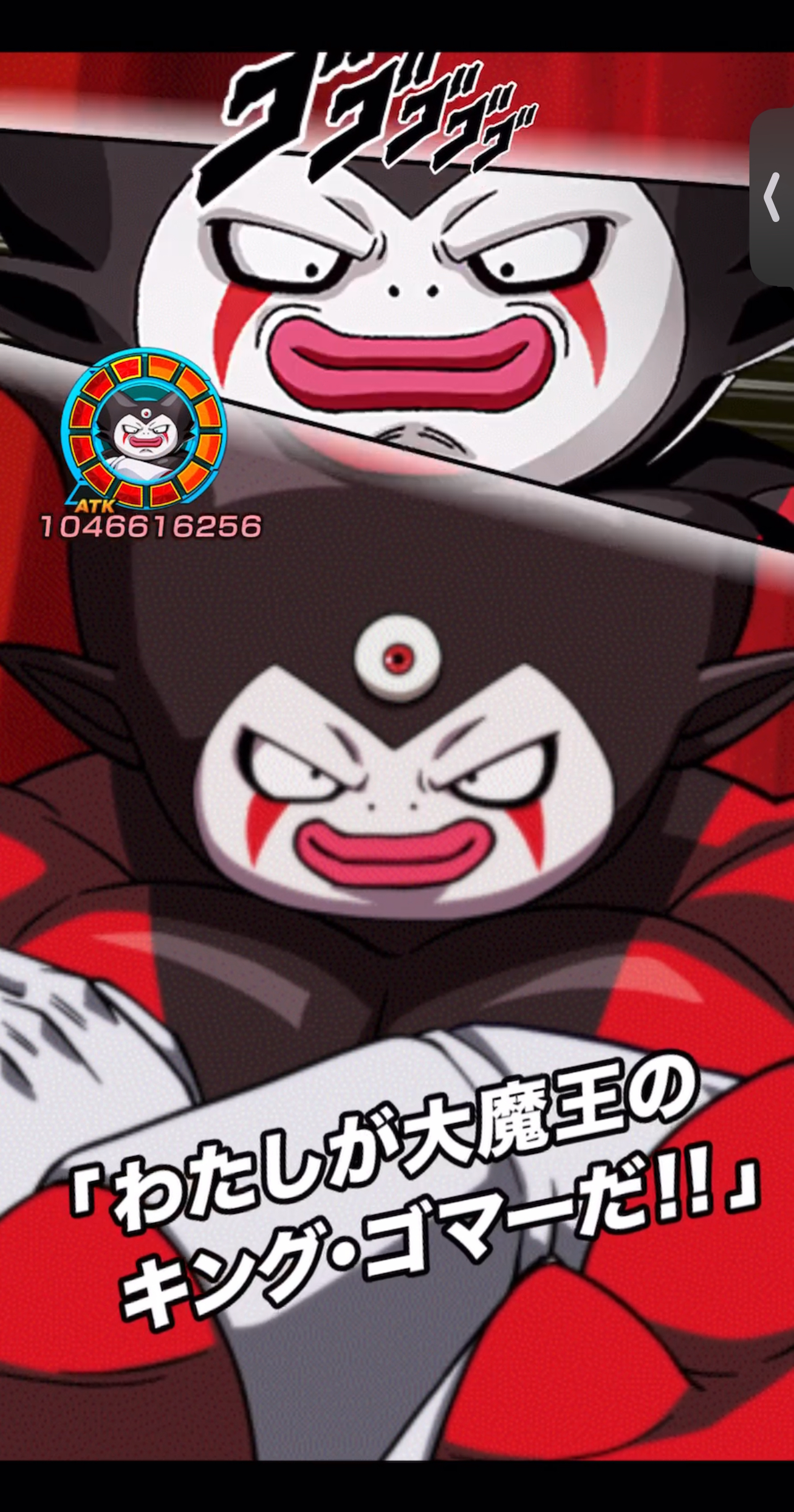 『バトル開始3ターン目』という浅さからこれ以上の火力を稼げるキャラというのはここ最近のフェス限LRくらいのもの、いかにゴマーの巨大化が攻防一体の優秀なスキルであるかも良く分かるでしょう。