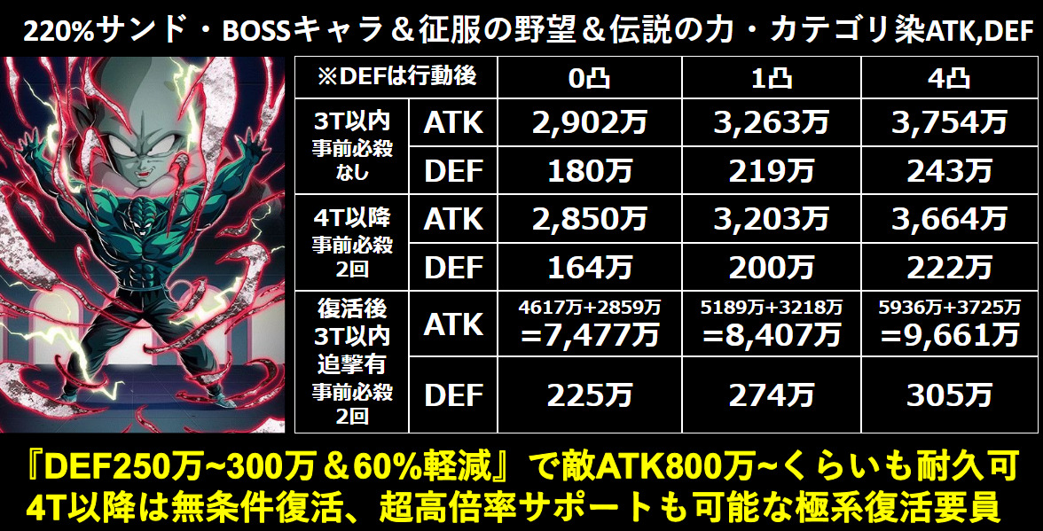 DEFはターン数や超必殺技を撃った回数に依存するのでブレますが、DEFスキル玉を付けておくだけで250万~300万は概ね安定、これなら敵ATK800万~900万くらいは十分に耐久ラインです。