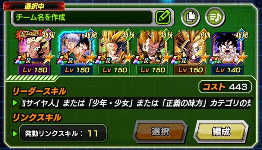 混血トリオ編成、とりあえずこれでええよな?何か318の日少年悟空とかズンズン悟飯とか他にも入れられそうなキャラ結構いるからこれでいいか気になって