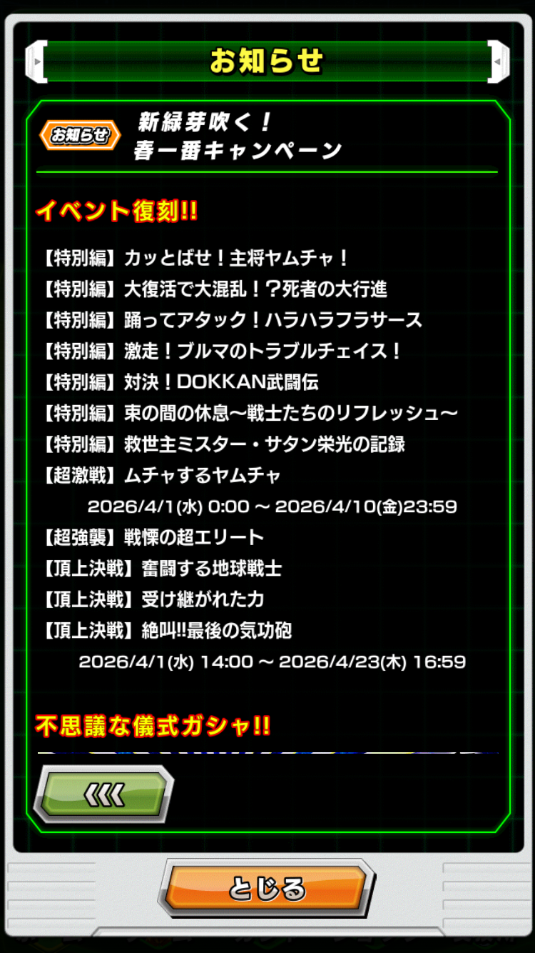 来週は目玉ガシャと天下一武道会があるので4/20~4/24辺りに回されそうでもありますが、後述しますが4/23から新CPが始まりそうでもあるので新キャラ実装と同時くらいに来るかも?