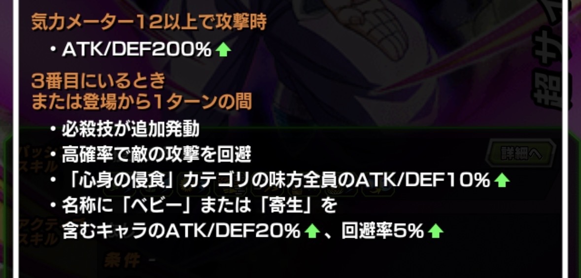 | 〇基本効果 ・気力+2、ATK/DEF150%up ・高確率で会心が発動 ・必ず追加攻撃し高確率で必殺技が発動 ・超高確率で追加攻撃し高確率で必殺技が発動 ・気玉変化:体⇒速 ・高確率で敵の攻撃を回避 〇攻撃時 ・ATK/DEF150%up 〇攻撃するたび ・そのターン中、回避率5%up 〇必殺技を発動するたび ・そのターン中、回避率5%up 〇バトル中3回攻撃するたび ・必ず追加攻撃し超高確率で必殺技が発動(ターン中最大1回) 〇攻撃を受けるとき ・DEF150%UP 〇チームに自身の他に『託された意志』または『人造人間/セル編』カテゴリの味方がいるとき ・味方全員の気力+1、ATK/DEF50%up |