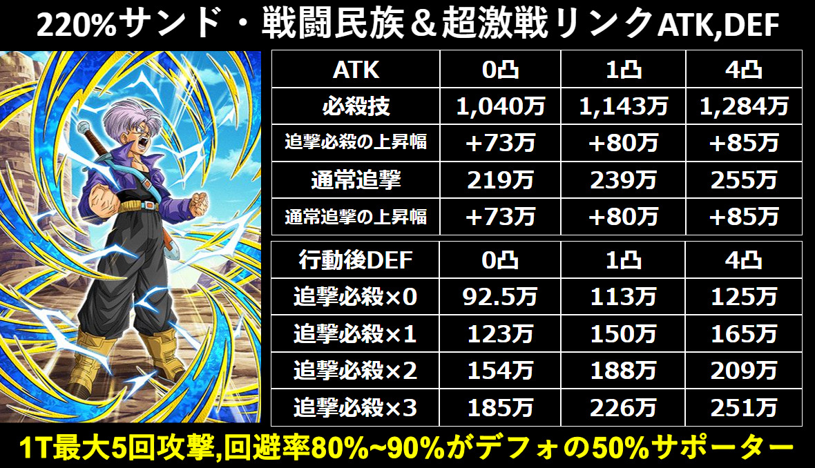 変身さえすればDEFも回避率も底上げされるのでこの弱点は大幅に緩和されるのですが、これは最速でもバトル開始5ターン目と遅めな上、その最速変身を狙うには『超サイヤ人リンクも臨戦態勢リンクも伝説の力リンクも無いトランクスを2番手に置く』という必要があるのでチームに負担を掛けてしまうしでやはり問題はあるでしょう。