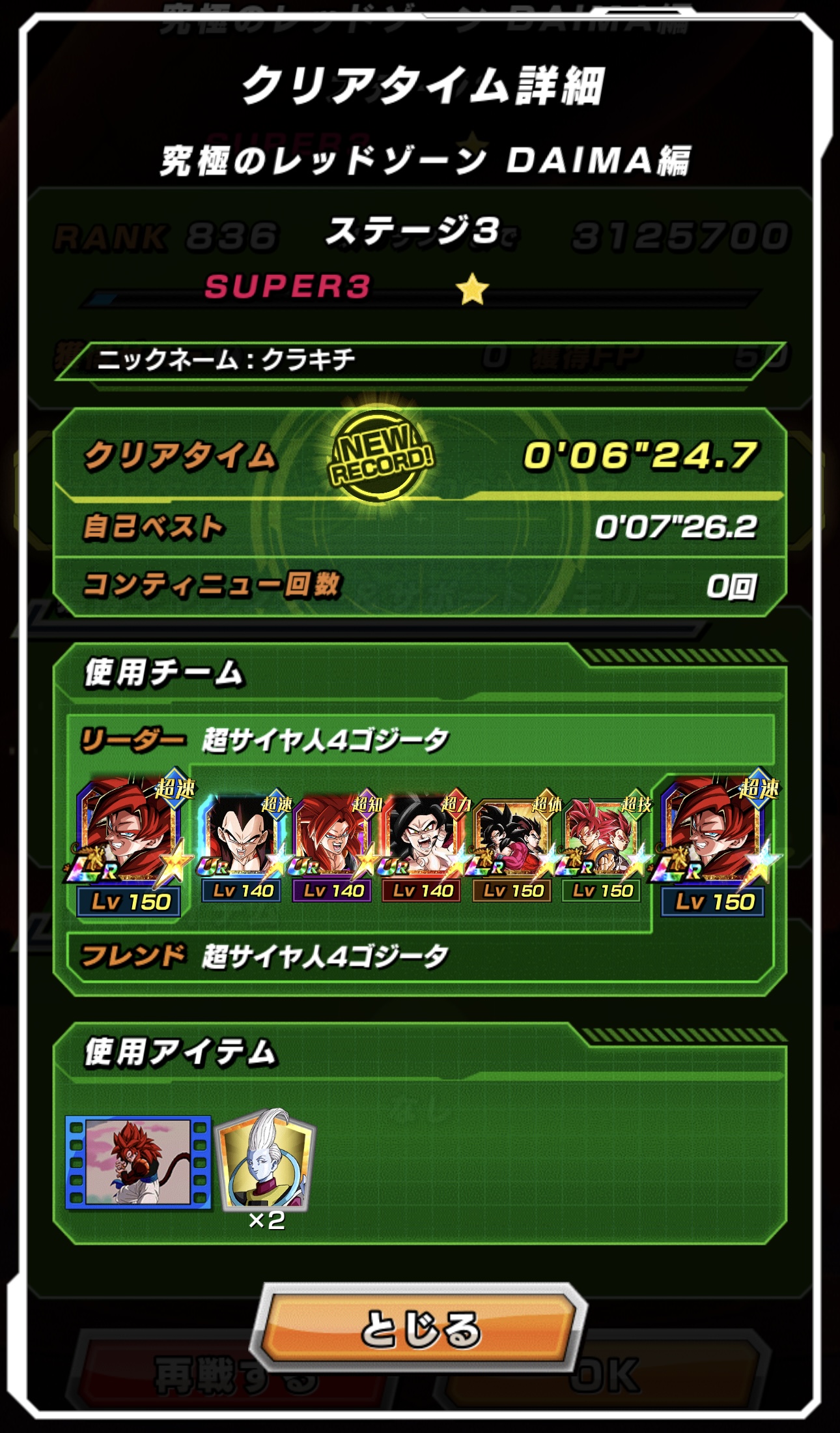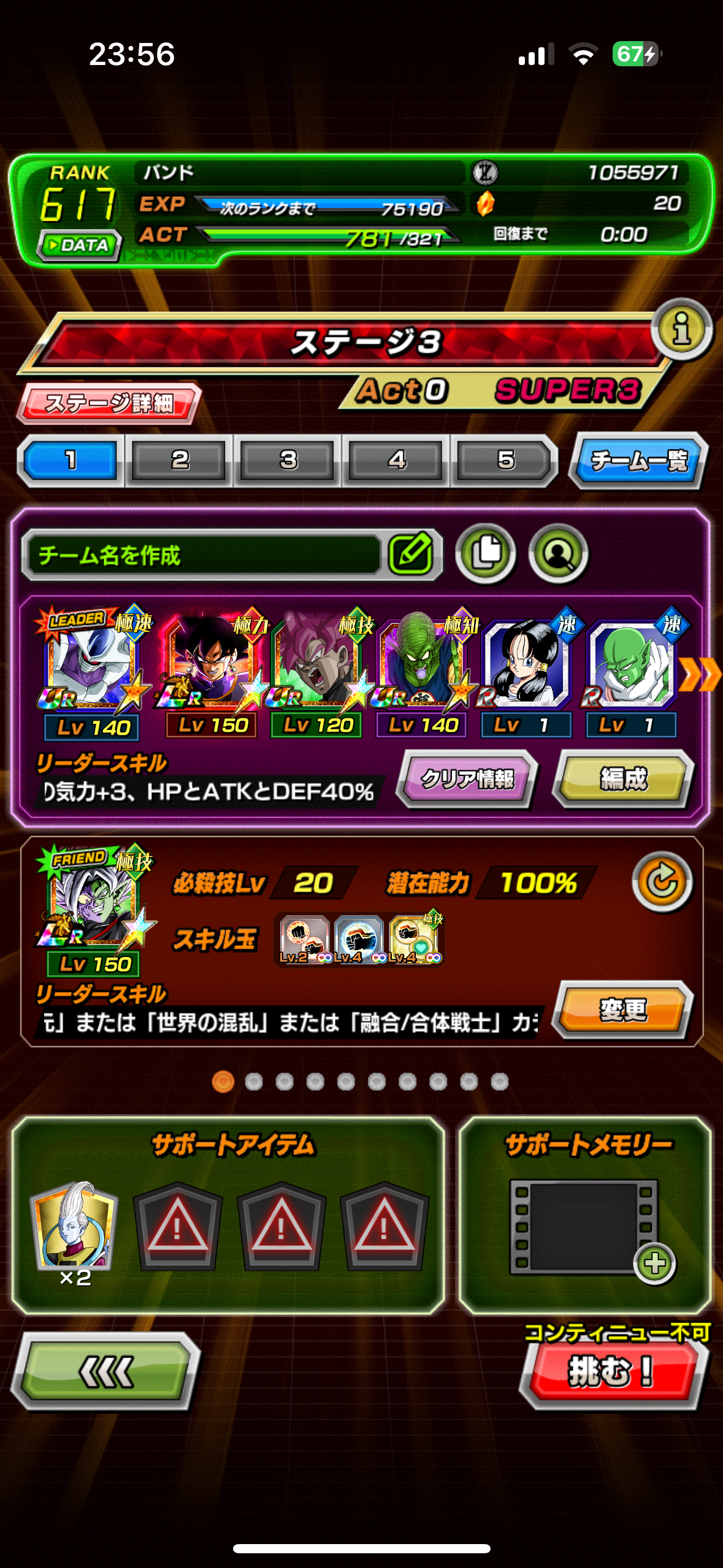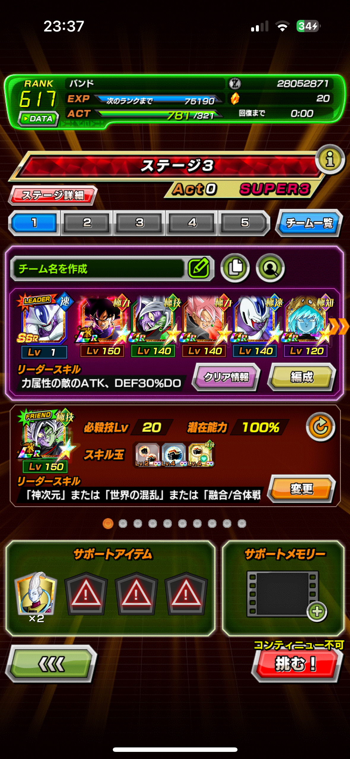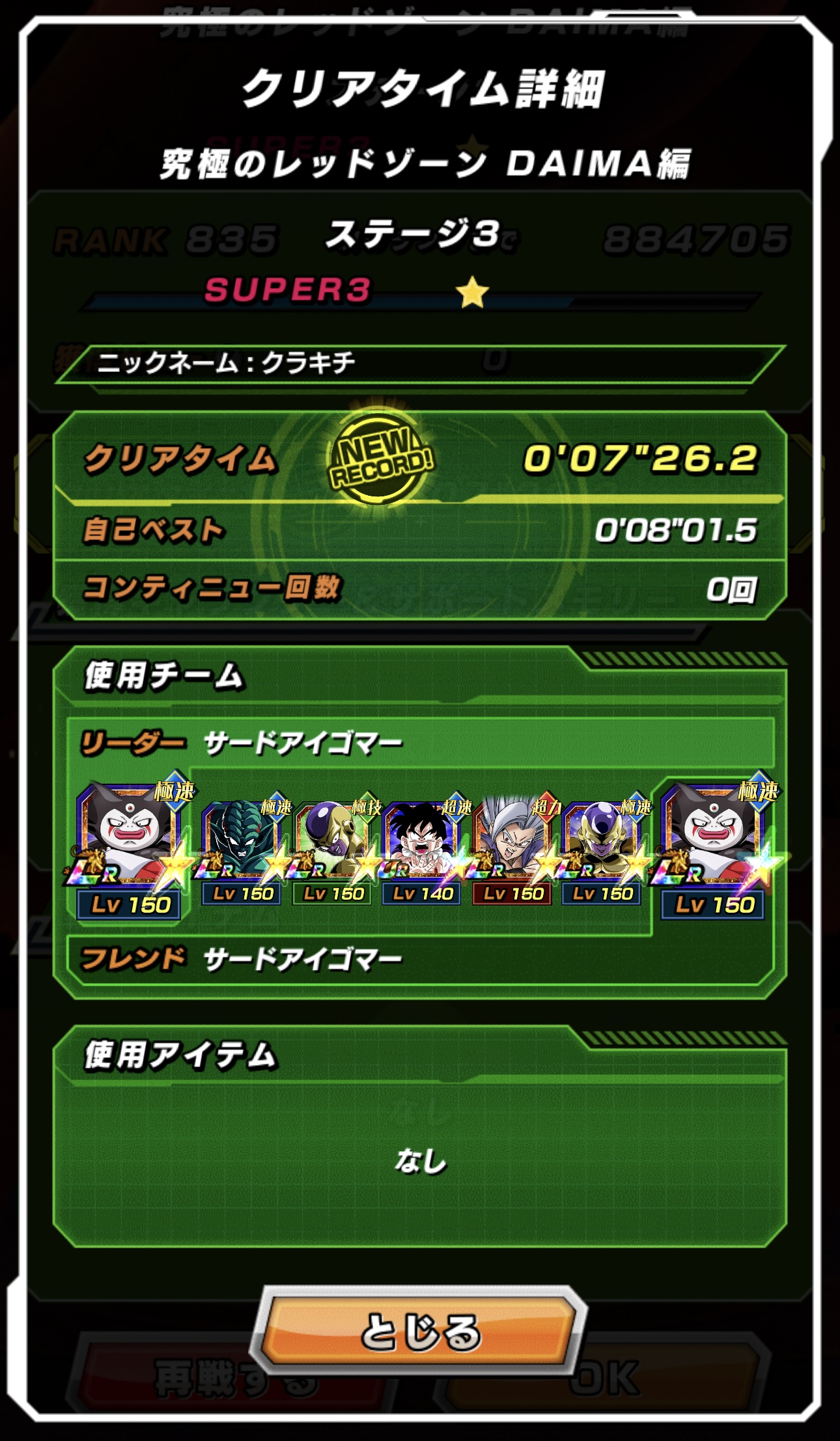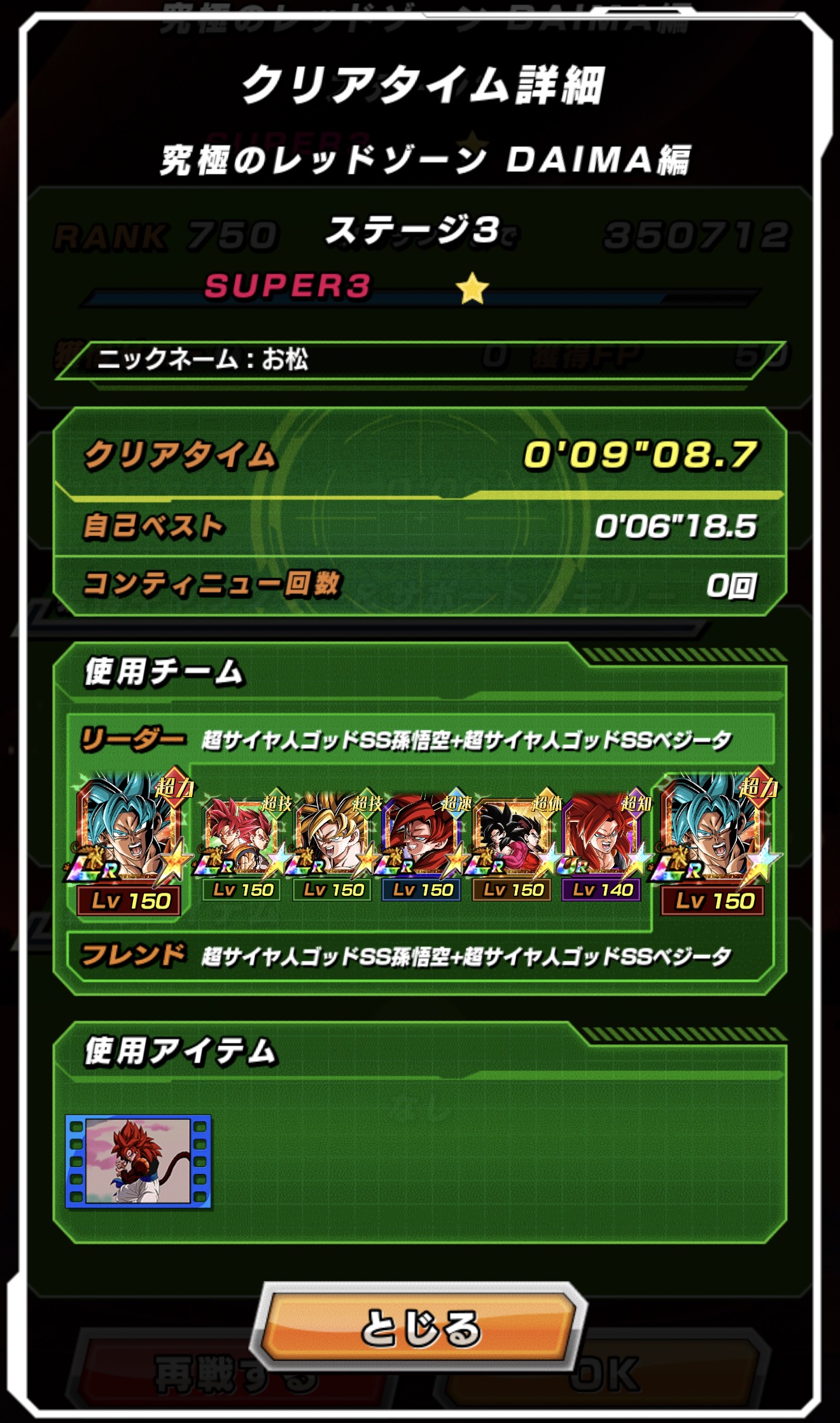 1枠目に絶対必殺技飛んでくるので、ベジータ、ロゼ、ナマズにアイテム使って100%軽減で受ける。(速ゴルフリはアイテムなしでok)
