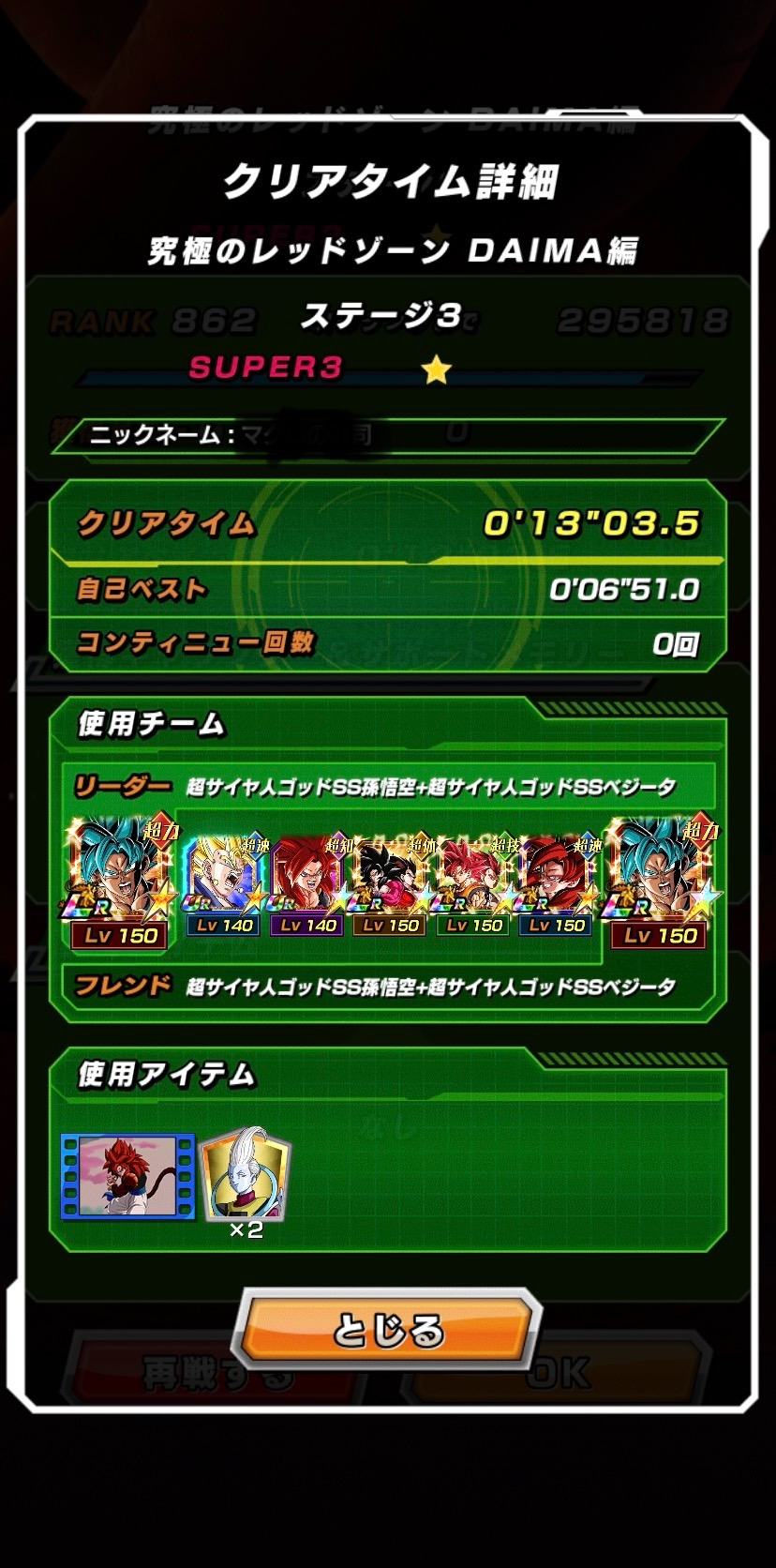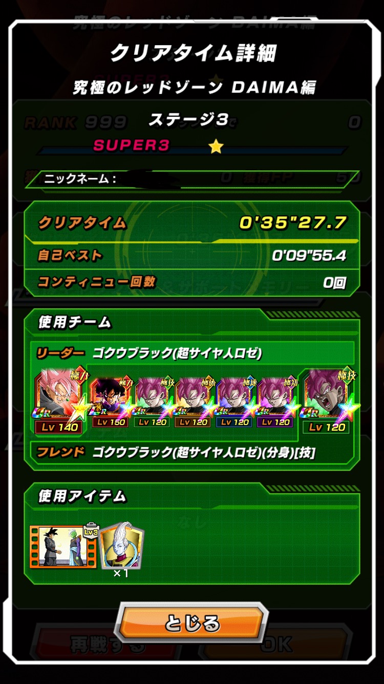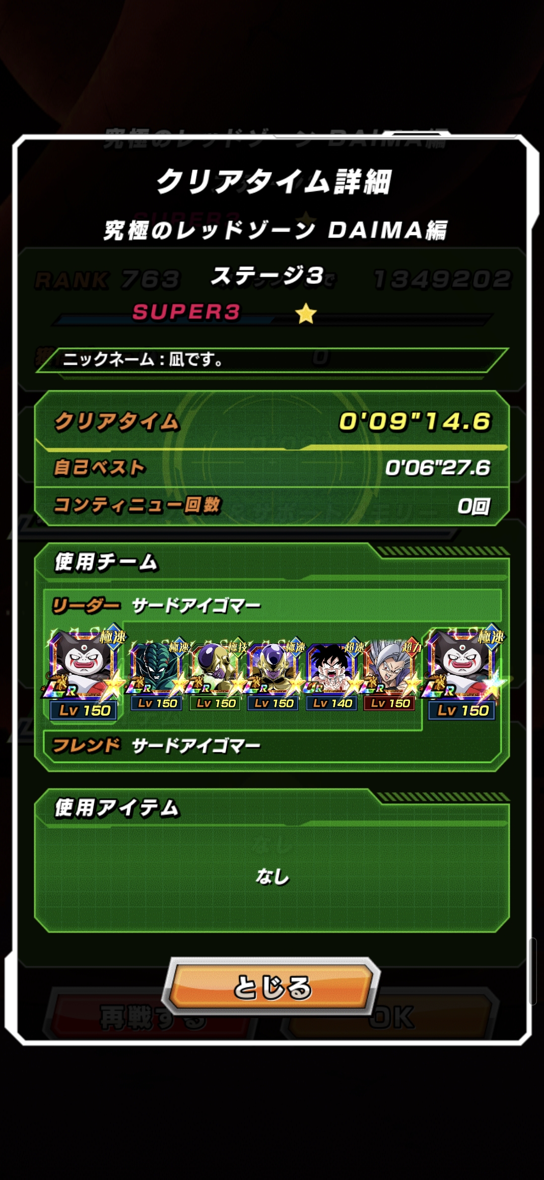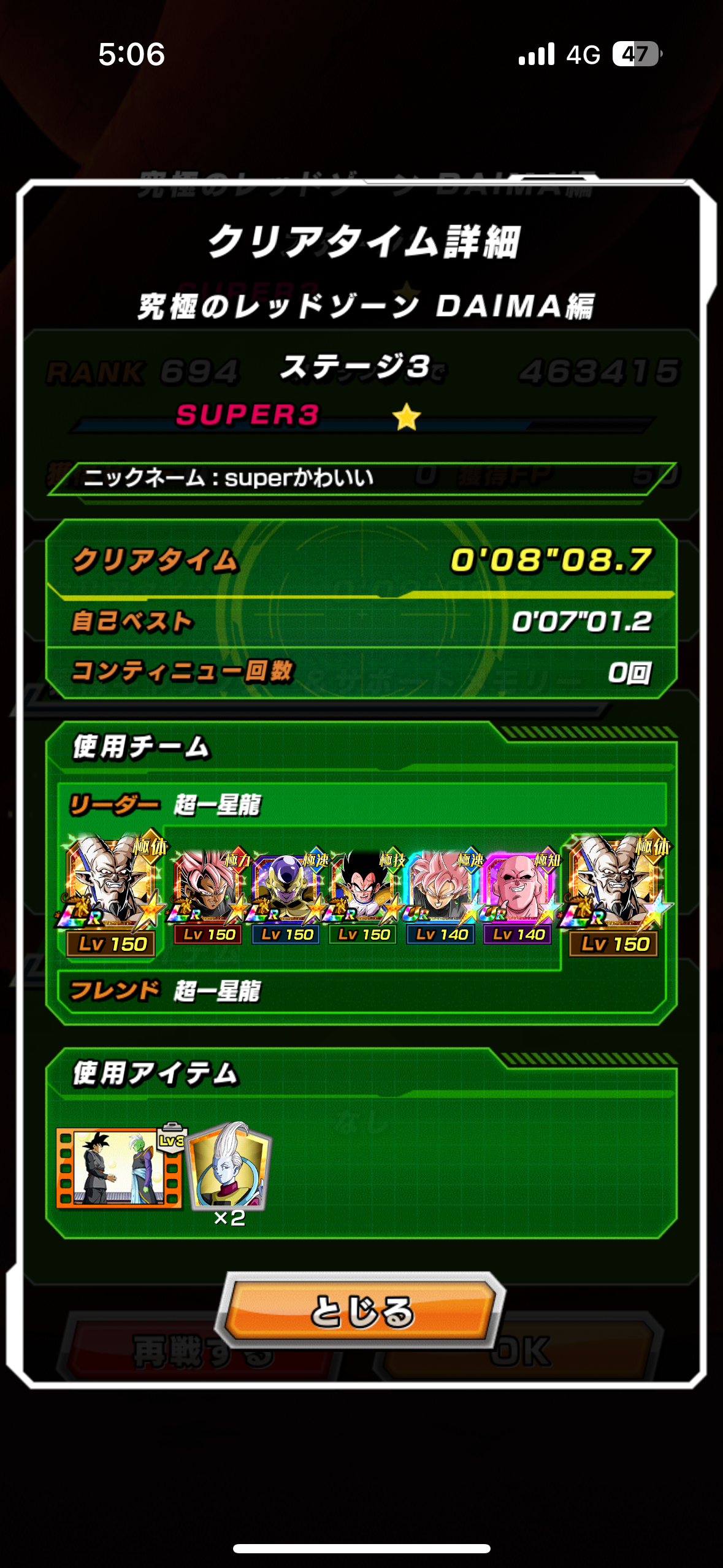 1枠目に絶対必殺技飛んでくるので、ベジータ、ロゼ、ナマズにアイテム使って100%軽減で受ける。(速ゴルフリはアイテムなしでok)