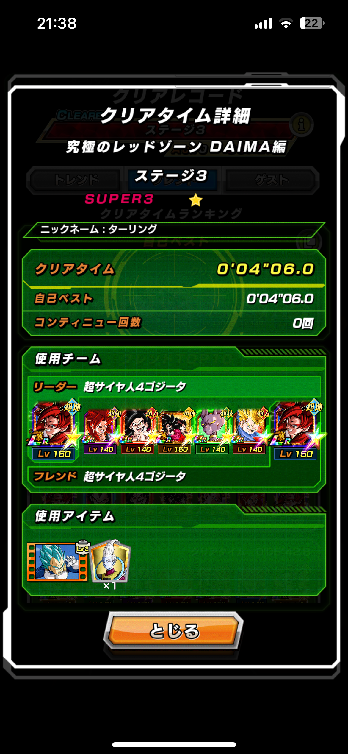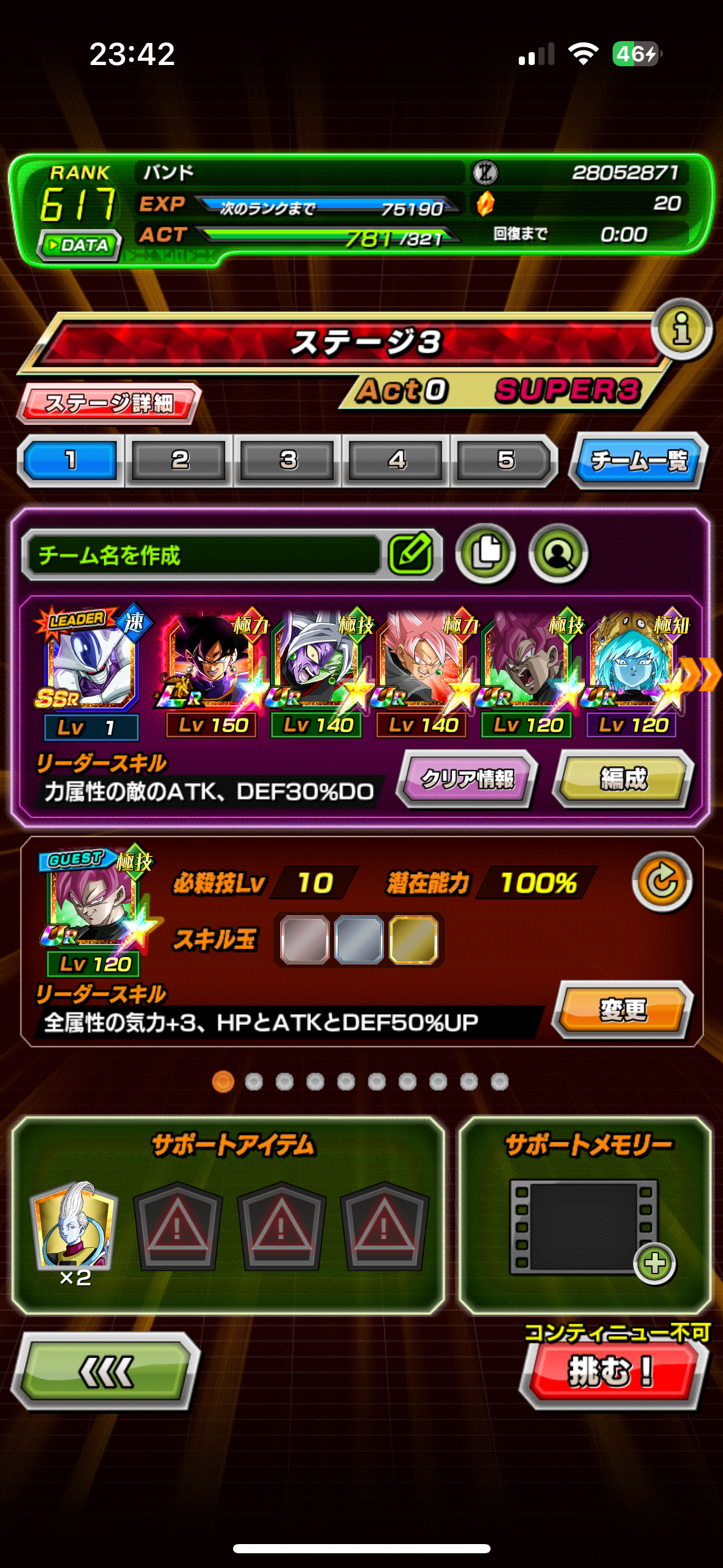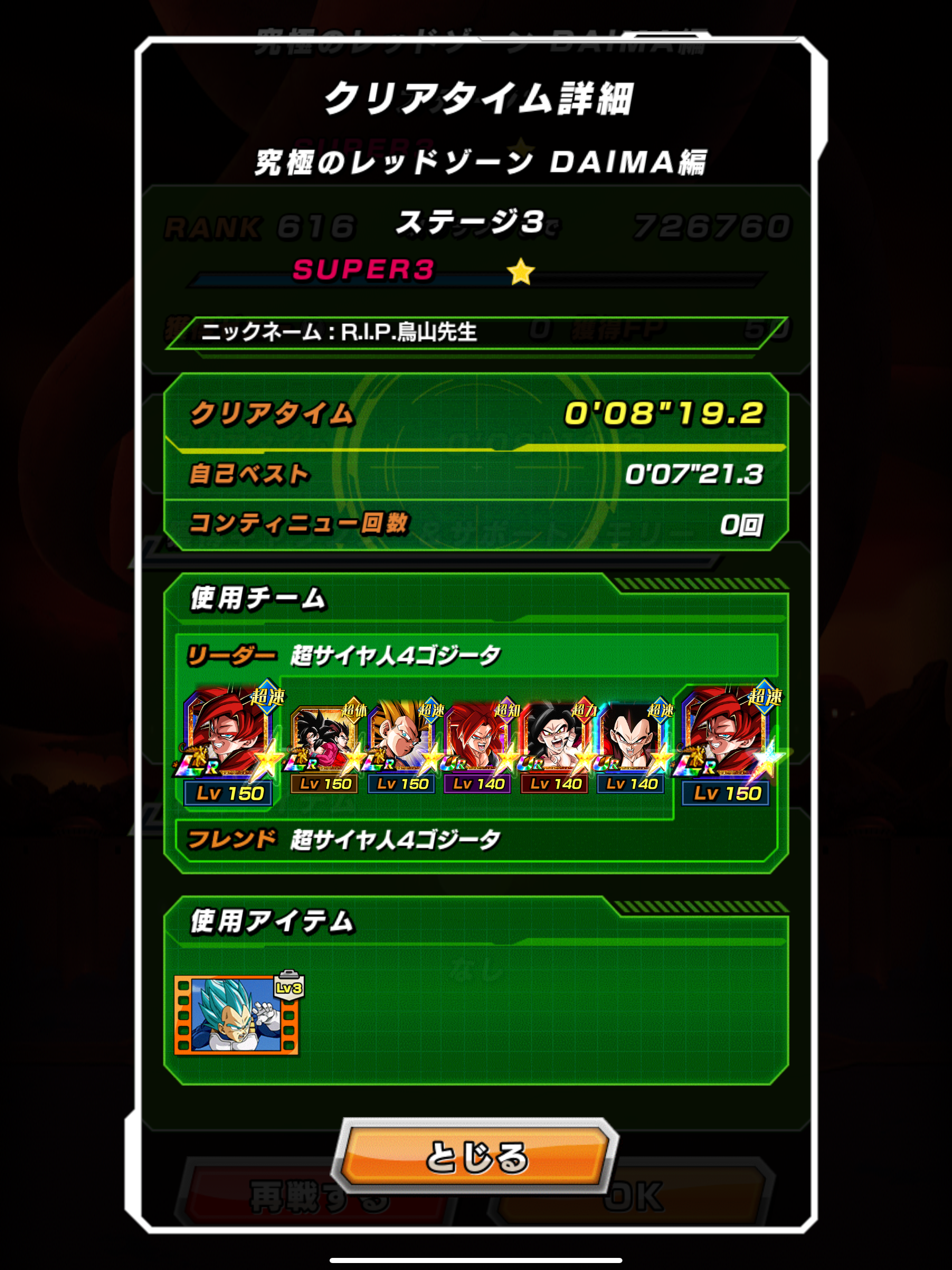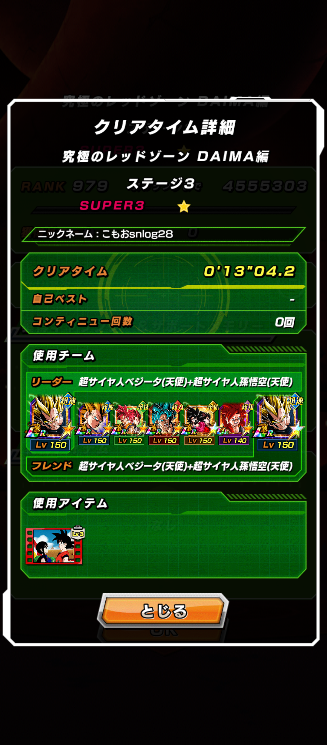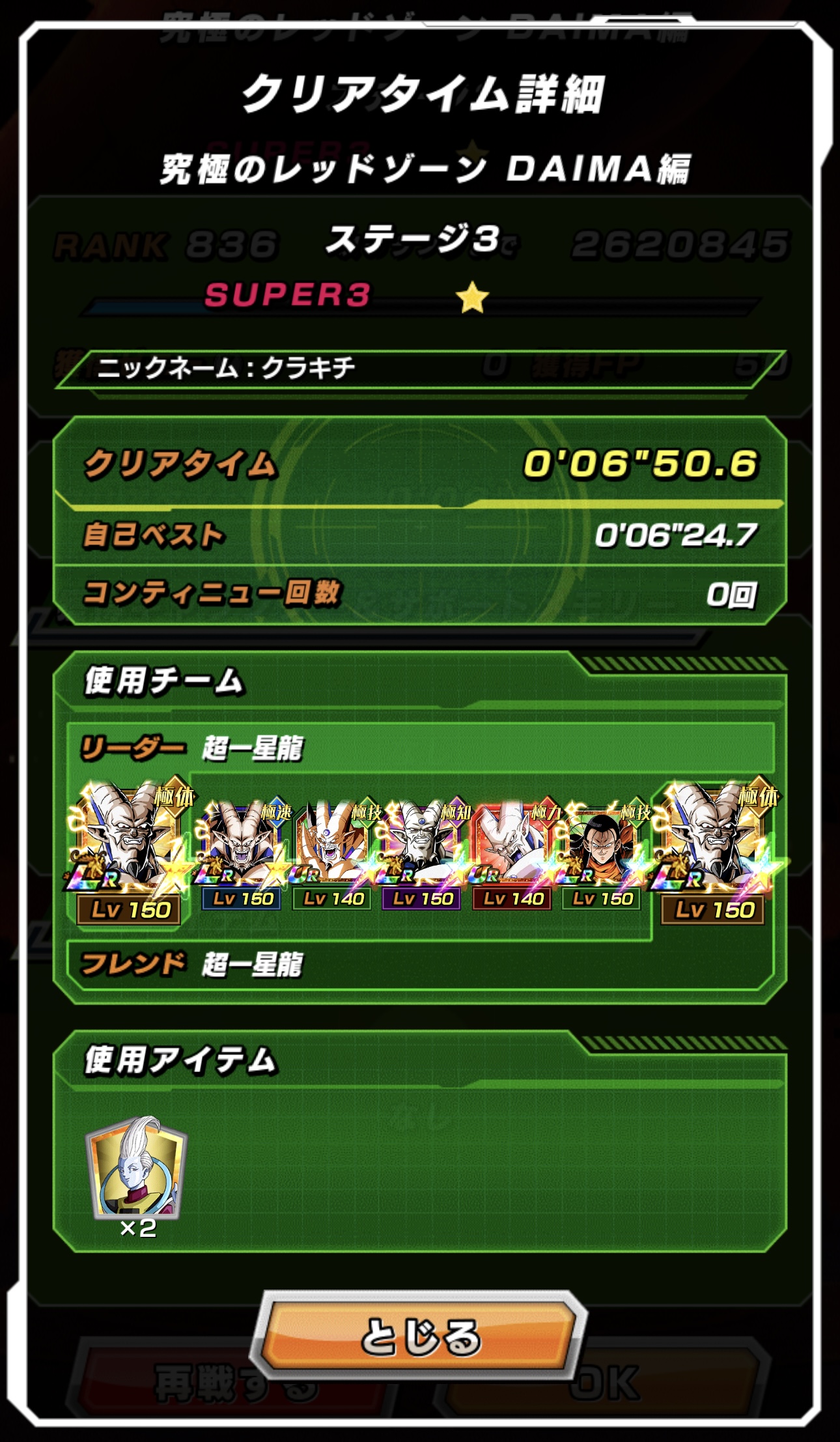 1枠目に絶対必殺技飛んでくるので、ベジータ、ロゼ、ナマズにアイテム使って100%軽減で受ける。(速ゴルフリはアイテムなしでok)