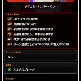 特殊ギミック:全体攻撃、ATK低下以外のデバフ無効、味方1体の必殺技を必ず封じる、ターン経過ごとにATK50%UP(最大250%)、回避を無効