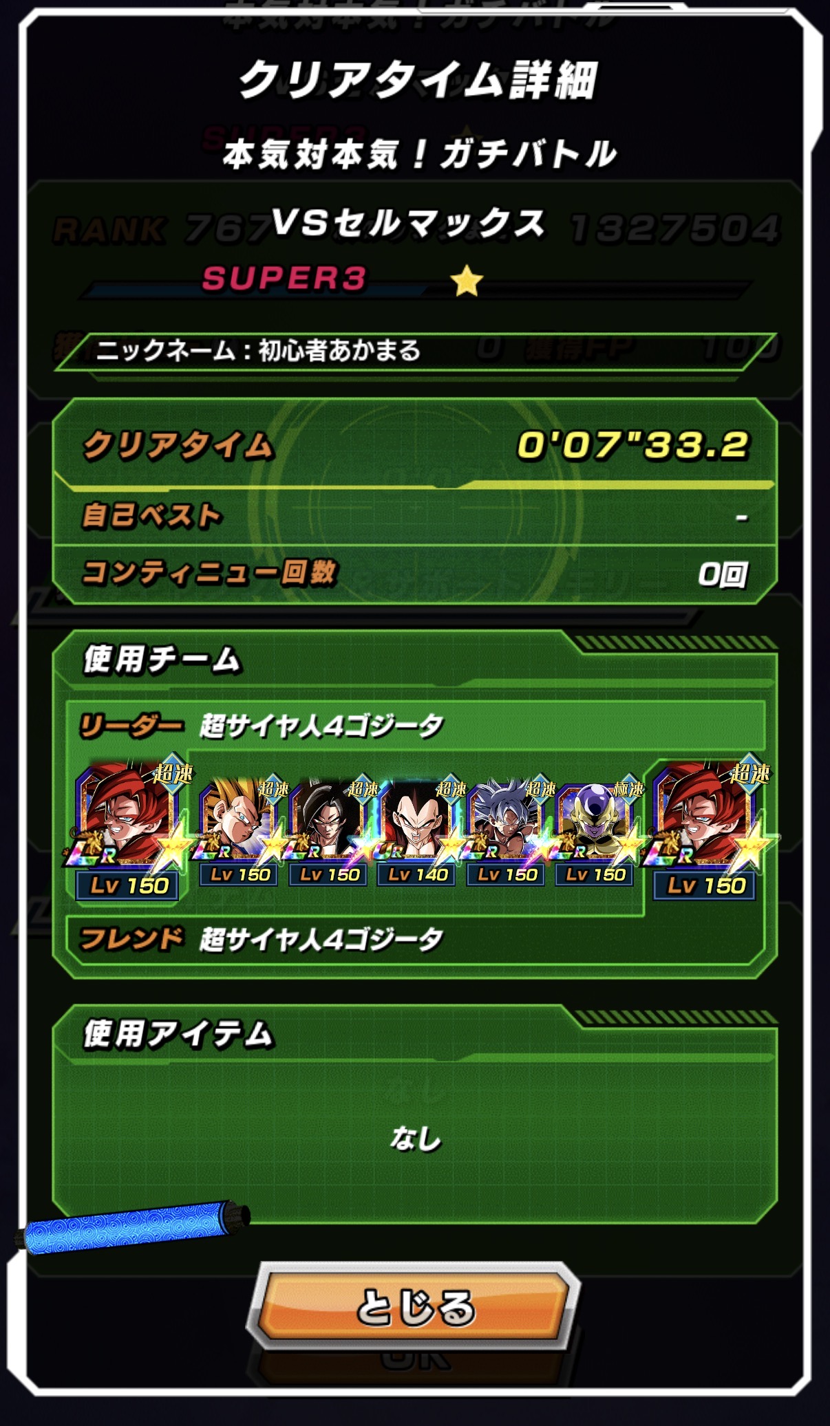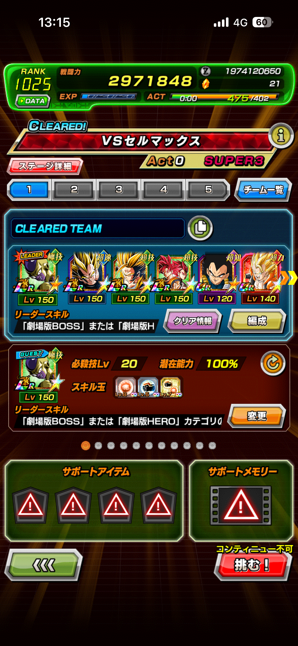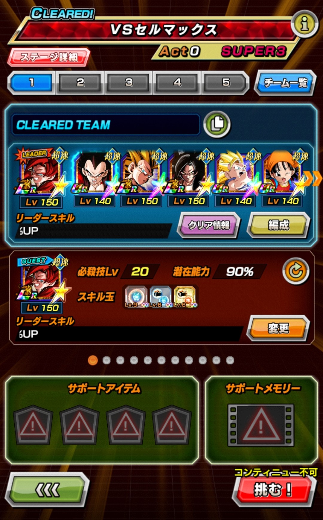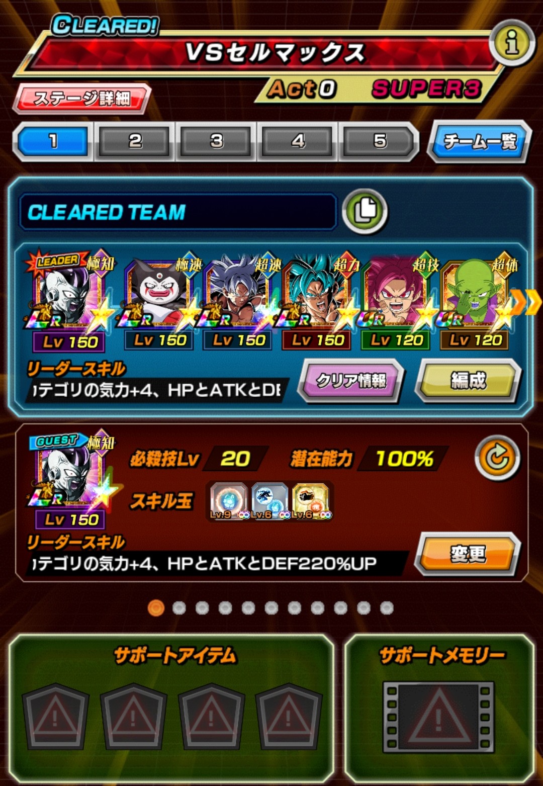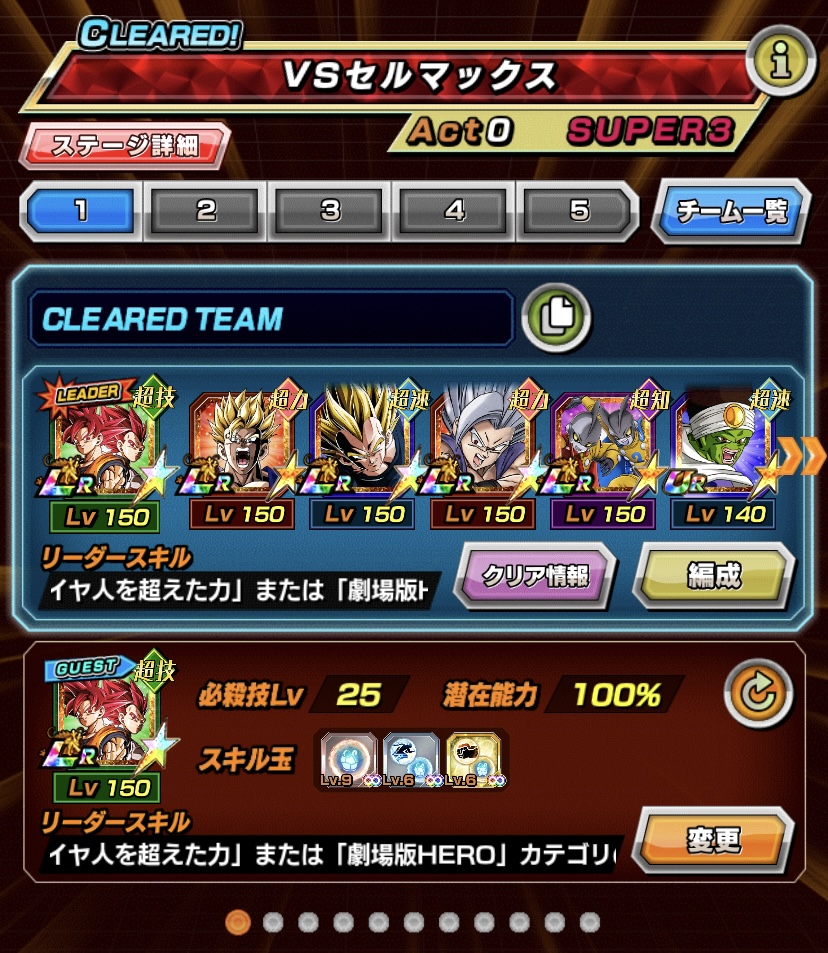 速属性縛り・劇場版HERO縛りを上記の編成でクリアしてみました。速はリダフレ同キャラ、劇場版HEROはフレンドにLR【揺り動かされる戦闘本能】ゴールデンフリーザ+ゴジータを選んでいます。