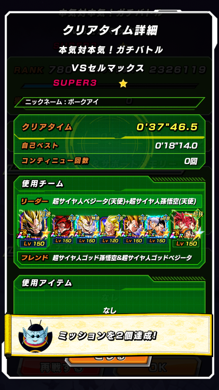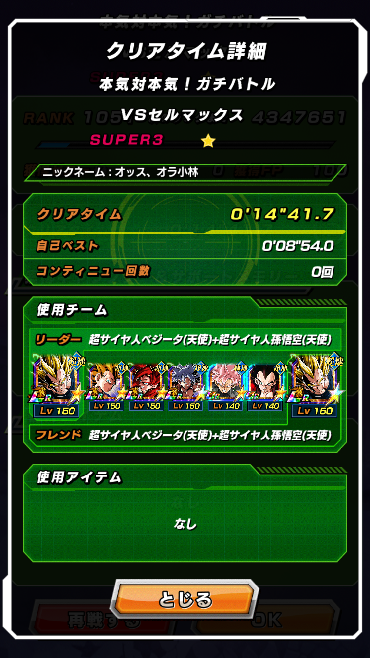 初手は10ゴジ来たら終わり、LRゴテトラと10周年4悟空が来たら回避お祈り、それ以降はターン経過で弱体化した速天使3悟空が隙晒さんように隊列調整して最後はフレンドのゴッドコンビのアクティブと必殺でクリア