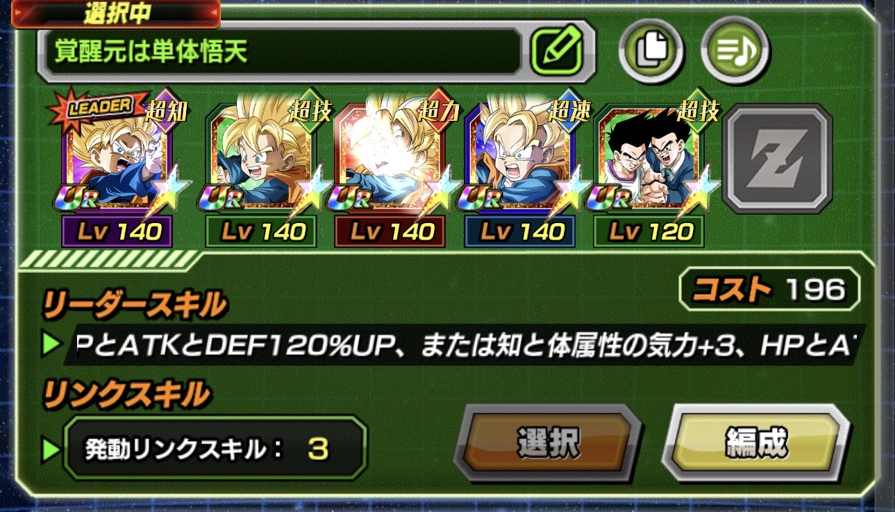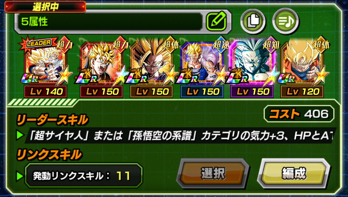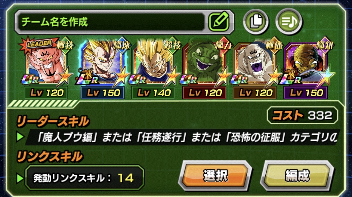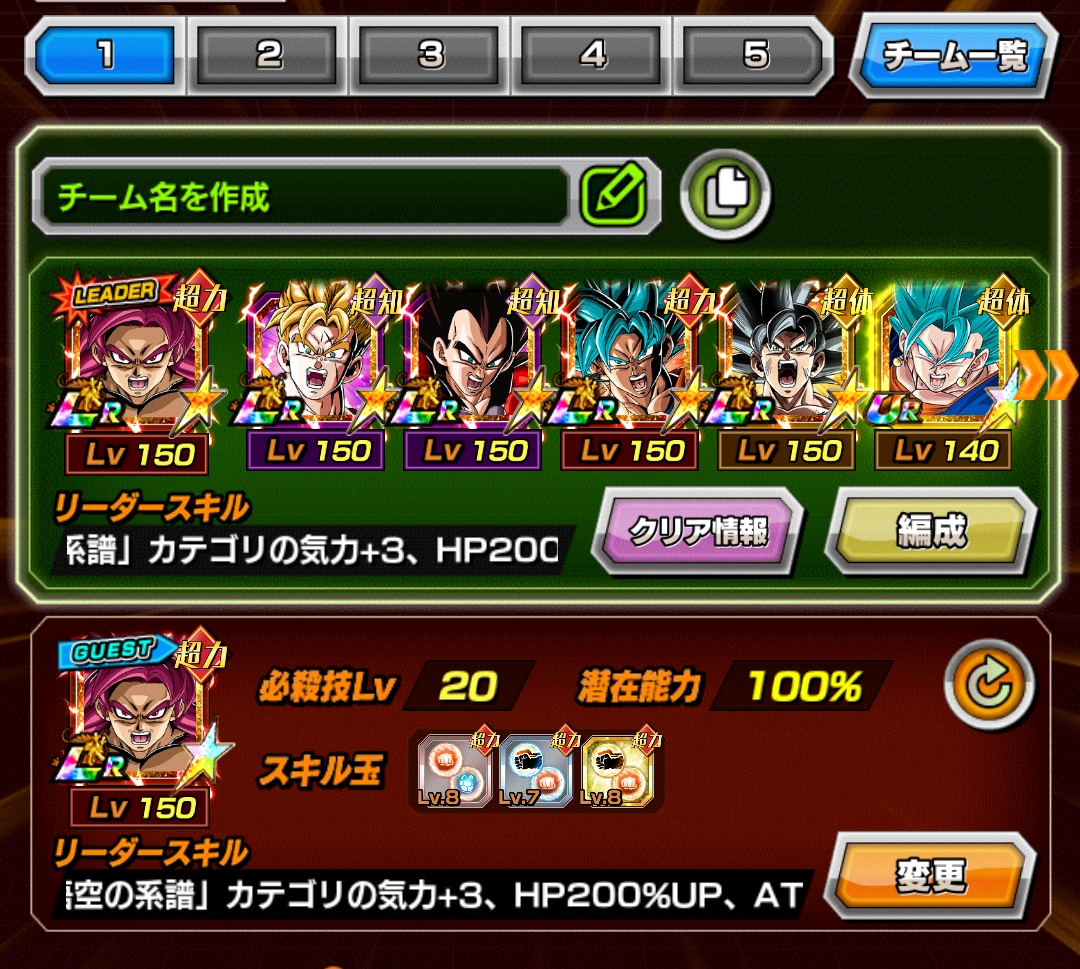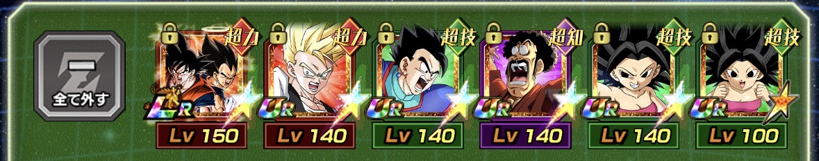 今のガシャにいるキャラだと技ベジット、速4悟空、知進化ベジータ、力親子三大悟飯、サタンとか?あと1枠穴埋め欲しいけど超極限した速のベジットとかかなー